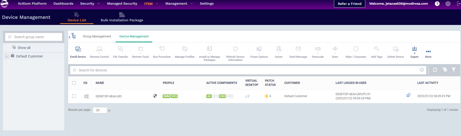 El funcionamiento de esta herramienta es instalar agentes en todos los computadores y desde una consola central en la nube se puede administrar. Para esto tenemos que crearnos una cuenta en la pagina oficial www.xcitium.com/free-edr/ y luego de eso la misma pagina facilitará el link de descarga del agente para poder instalarlo en los distintos hosts. Una vez ya instalado el agente se debería ver reflejado el agente en la consola de administración en la web en la sección de EndPoint y tenemos que instalar el modulo de EDR en “install or Manage Packages” pero primero se selecciona el agente para poder habilitar esa opcion y luego donde dice “Install additional Xcitium Packages” y seleccionamos “Install Xcitium Client – EDR” donde nos pedirá reiniciar el host una vez haciendo click en “Install”. Una vez reiniciado el agente el módulo EDR debería estar activado en la consola central una vez actualizada la pagina.