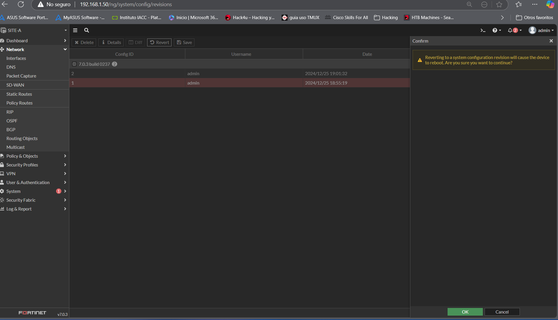 para restaurar es lo mismo pero se reemplaza backup por restore y luego se reiniciará para cargar el archivo de configuracion nuevo execute restore config ftp SITE-A-25.12.2024 200.212.31.2 ftp ftp
