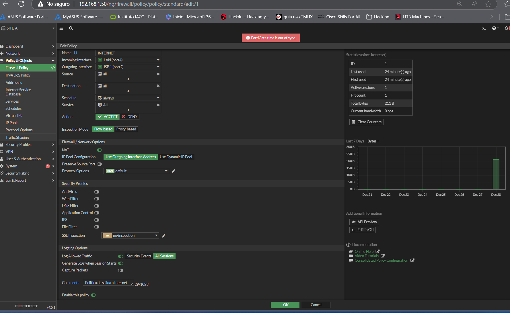 tenemos que crear una regla que se encuentre por encima de esta regla para que pueda generar trafico a internet. Es recomendado tener una vista de las politicas por par de interfaces para así poder entender con mayor claridad como se encuentran las politicas por interfaces de entrada y por interfaces de salidas y eso se selecciona con “Interface Pair View”. Para crear una nueva politica se hace en “Create New” y en el primer campo “Name” se le asigna un nombre identificativo a la politica creada, en el segundo campo “Incoming Interface” es el numero de puerto en donde ingresará o recibirá el trafico el Fortiget para esa politica (en este caso port4 LAN), en “Outgoing Interface” es por donde saldrá el trafico de esta politica (que en este caso port2 ISP1), en “Source” se podria especificar que usuario, direccion IP o que equipo será el que enviará el trafico (en este caso le pondremos el objeto “all” que corresponde a cualquiera), en “Destination” tambie pondremos el objeto “all” debido a que queremos permitir llegar a todo internet, en “Schedule” es el rango u horario que queremos que funcione está politica (en este cado seleccionamos el objeto “all”), en “Services” se refiere a puertos y servicios que hayamos definidos en la seccion de “Services” de la parte de objetos y en este caso ocuparemos “all”, en “Action” indicamos si está politica se deniega o se acepta y en este caso pondremos accept, “Firewall/Network Options” como es una salida a internet tendremos que natear la direccion de origen para que todas las peticiones se hagan con la direccion ip de la interfaz del Fortigate y podriamos poner una IP o utilizar un pool de direcciones IP en caso de tenerlas, en “Logging Options” seleccionaremos que logee todo el trafico en todas las sesiones “All Sessions”, que genere logs cuando inicien las sesiones “Generate Logs when Session Starts” y por ultimo habilitar la politica en “Enable this Policy”
