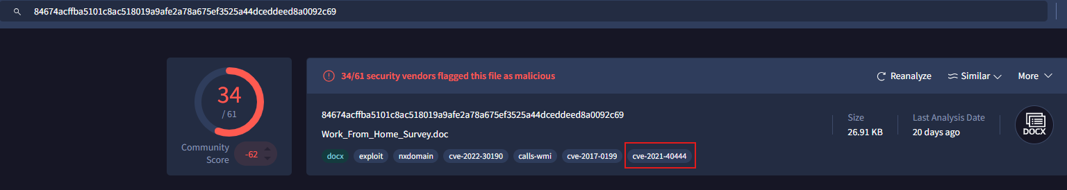 y la respuesta a la pregunta es arsenal.30cm.twPregunta 3; Examinando el archivo Work_From_Home_Survey.doc, ¿cuál es el dominio malicioso en el archivo doc? En esta pregunta nos pregunta por un archivo .doc por lo que segun google nos tenemos que centrar en lo siguiente;