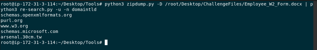 domaintldsegun indicando en la libreria de github de DidierStevenSuite quedando con el siguiente comando;python3 zipdump.py -D /root/Desktop/ChallengeFiles/Employee_W2_Form.docx | python3 re-search.py -u -n domaintld