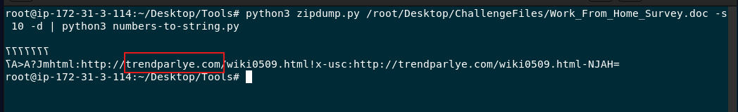 python3 zipdump.py /root/Desktop/ChallengeFiles/Work_From_Home_Survey.doc -s 10 -d | python3 numbers-to-string.py
